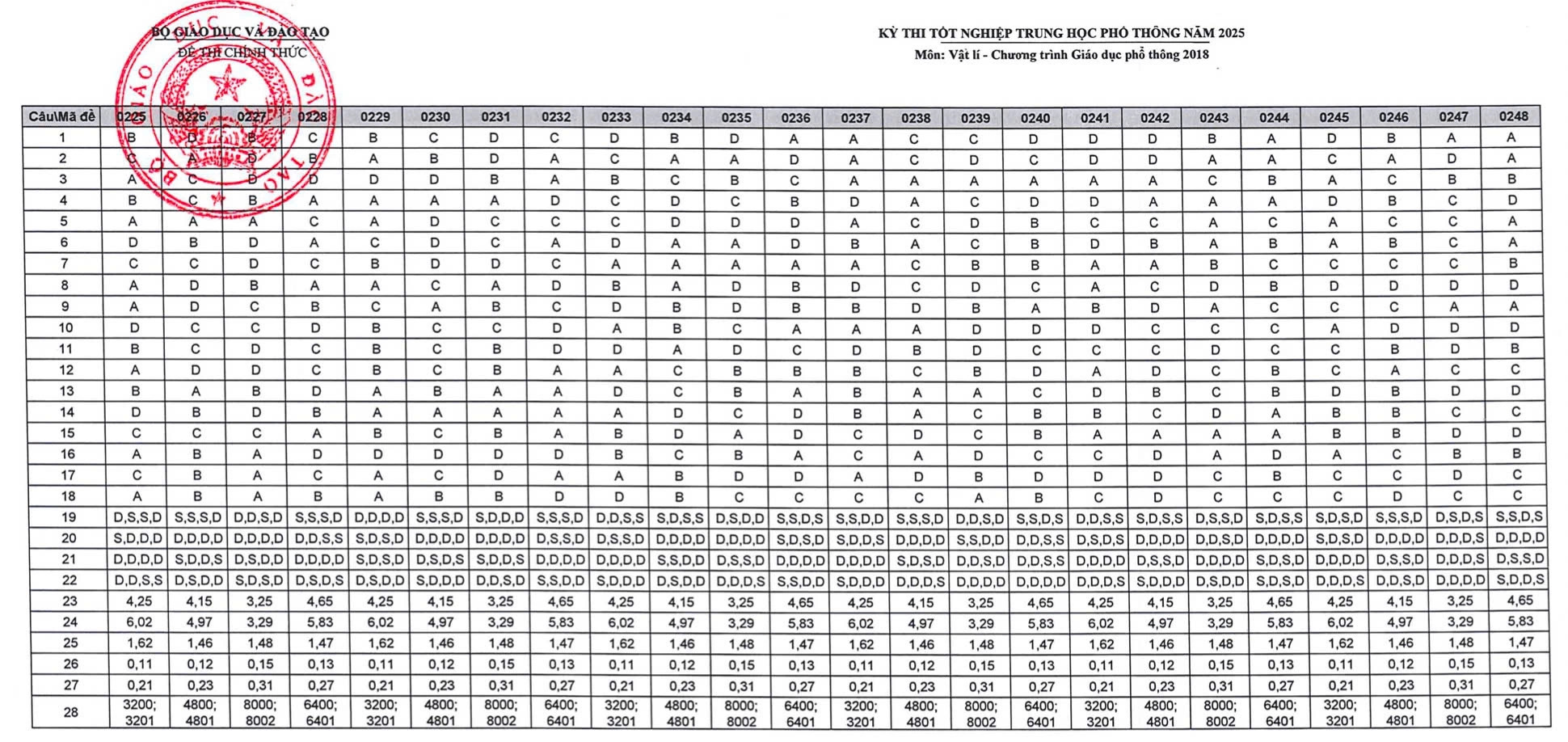 Đáp án chính xác từ Bộ Giáo Dục và Đào Tạo.